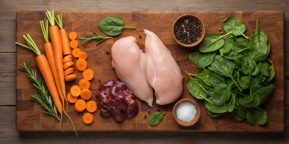 A base da alimentação natural reside na variedade. O equilíbrio entre proteínas, vísceras, ossos e vegetais dita o sucesso da dieta.